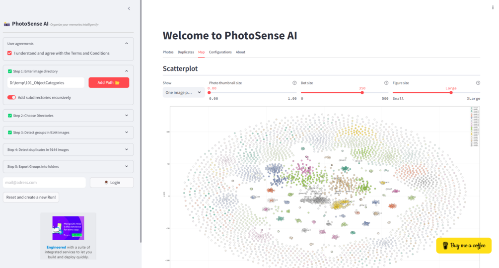 PhotoSenseAI is a tool to organize your photo collections. It can structure thousands of photos into albums and find duplicate images using A.I. techniques. The best part is that the tool runs locally on your own machine and entirely offline. Your personal photos will never leave your own machine again.